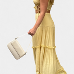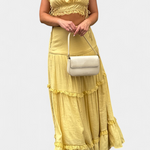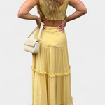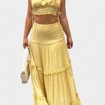 El conjunto Ilys es una oda a la feminidad etérea. Compuesto por un crop top con tirantes ajustables y detalles de encaje, y una falda maxi fluida con delicadas capas, este look aporta un aire vintage con frescura contemporánea. Ideal para escapadas veraniegas, celebraciones al aire libre o tardes relajadas con encanto.