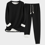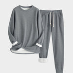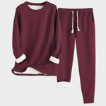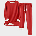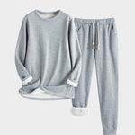 El conjunto incluye un jersey de manga larga y pantalón con cintura elástica, ideal para descansar o pasar un día relajado en casa. Su interior forrado de felpa mantiene el calor sin perder comodidad.