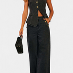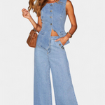 El conjunto Ludovica redefine el denim con un toque sofisticado. El chaleco ajustado sin mangas abraza la silueta con elegancia gracias a su cierre de botones, mientras los jeans de pierna ancha y tiro alto aportan comodidad y un look relajado y en tendencia. Perfecto para combinar estilo urbano con feminidad segura.