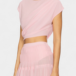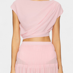 • Capas fruncidas que crean volumen suave con estilo romántico