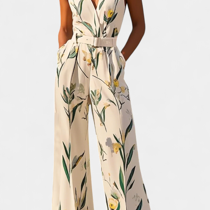 Slara Mono Largo de Vacaciones con Escote en V y Cinturón Ajustable