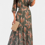 Feminidad relajada con un toque refinado. El vestido Aísha combina un estampado de hojas con una silueta ligera y elegante que realza con naturalidad. Su escote en V, mangas amplias y cintura definida lo convierten en la elección perfecta para sentirte especial sin esfuerzo, ya sea en eventos formales o días soleados con estilo.