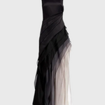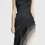 Sofisticación ligera con un juego de tonos que capturan todas las miradas. El vestido Angela combina un elegante escote barco sin mangas con capas de gasa que fluyen con naturalidad. Su degradado de negro a marfil aporta profundidad visual y una presencia refinada para ocasiones especiales.