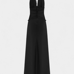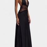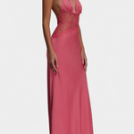 Un diseño que irradia sensualidad refinada y elegancia sofisticada. Ashanty combina un escote halter pronunciado con una delicada franja de encaje en la cintura, creando un contraste perfecto entre lo sutil y lo audaz. El tejido fluido envuelve el cuerpo con gracia, mientras que la espalda completamente descubierta añade un giro inesperado y atrevido.