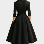 El diseño presenta un cuello cruzado tipo blazer que aporta un toque refinado y estructurado, mientras que la cintura entallada y la falda con vuelo crean una forma equilibrada y elegante. Las mangas tres cuartos ofrecen un aire distinguido, ideal para eventos, cenas o reuniones formales.