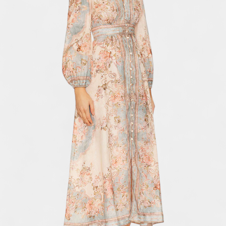 Dorotila Vestido Maxi Acampanado con Estampado Floral, Botones y Mangas Globo