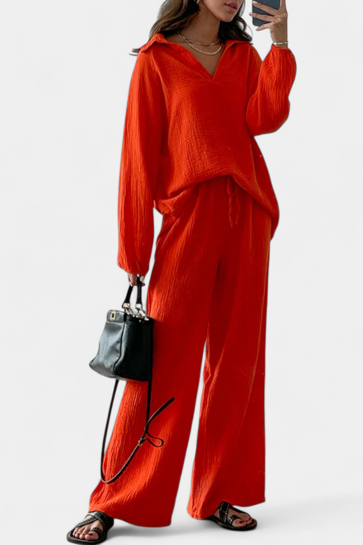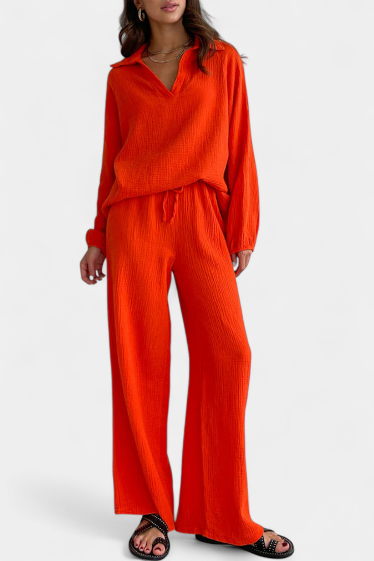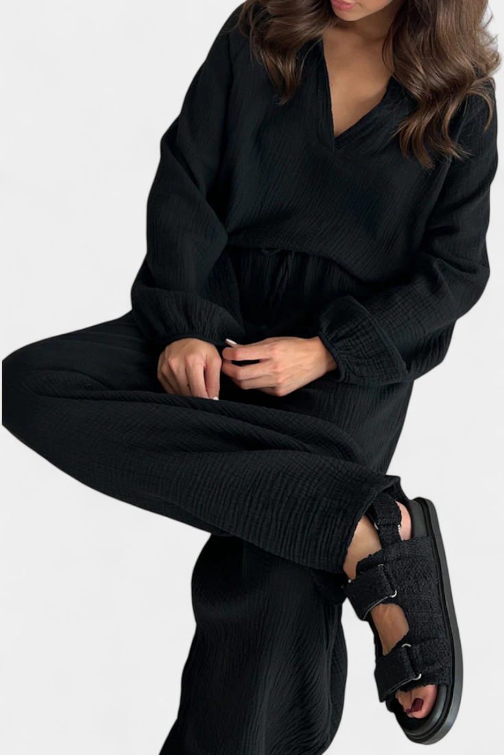 Comodidad moderna con un toque relajado. El conjunto Aya destaca por su tejido ligero de algodón, escote en V favorecedor y silueta fluida que se adapta con facilidad a cualquier día cálido. Su diseño de dos piezas crea un look coordinado y desenfadado, ideal para moverte con libertad y frescura dondequiera que vayas.