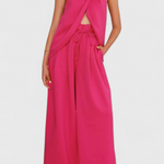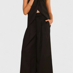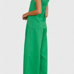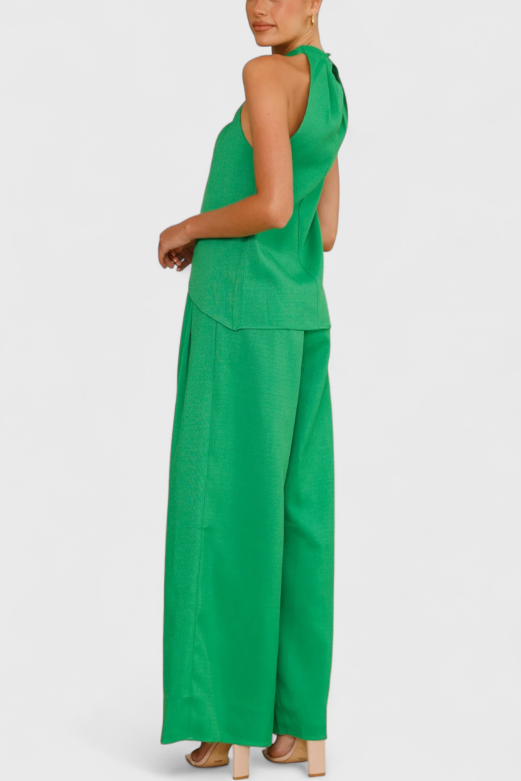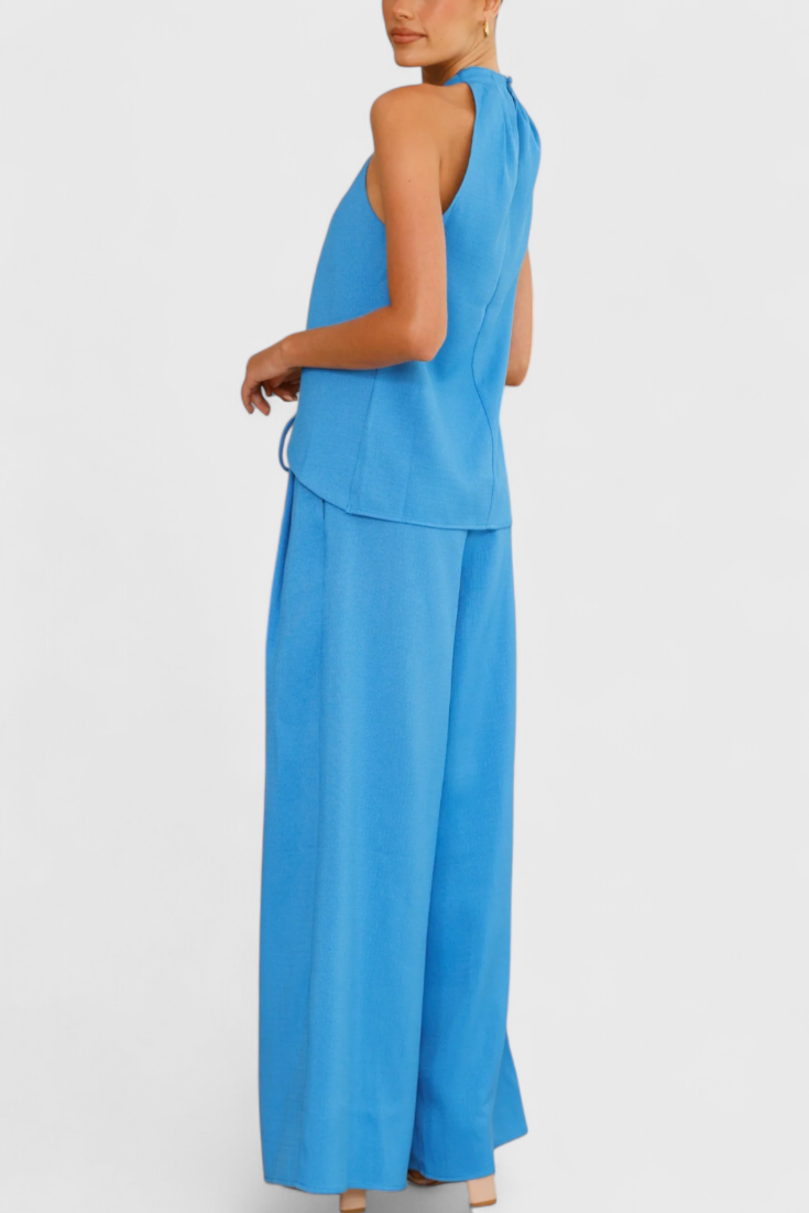 Frescura estructurada con un aire relajado y sofisticado. El conjunto Bernadina combina un top sin mangas con abertura frontal y cuello alto con un pantalón de pierna ancha y lazo en la cintura. Su mezcla de lino aporta ligereza natural, ideal para climas cálidos y escapadas con estilo.