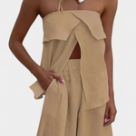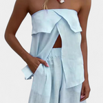 Un look poderoso con actitud veraniega. Oriana combina un top tipo bandeau con una falda larga de abertura lateral, creando una silueta estilizada y segura. El diseño minimalista resalta la figura con sutileza, ideal para quienes buscan destacar sin esfuerzo. Una opción versátil que funciona tanto para una cena junto al mar como para una tarde en la ciudad.